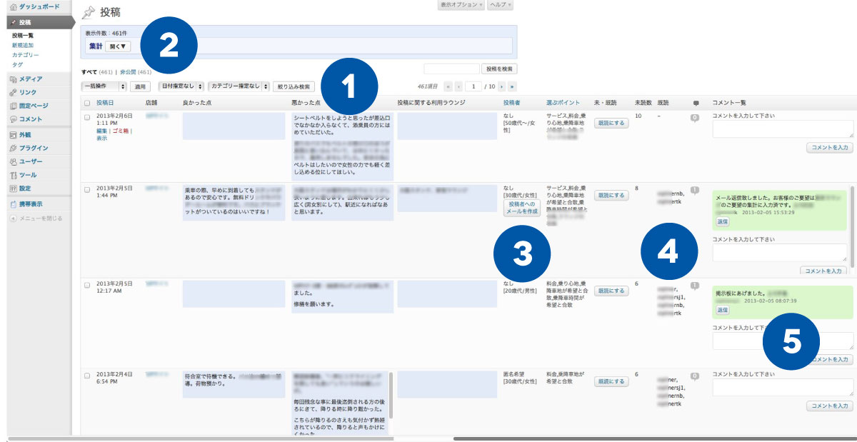 店舗ごと・月ごとなど、条件を絞り込んで書き込みのチェックが可能